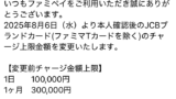 JCBカードのチャージ上限引き下げ(30万円→2万円)前に楽天キャッシュをチャージしておこうと、ファミペイの月間チャージ上限?を10万円→30万円にアップし、今月は今のところ15万円くらいチャージ済みで(タスクが渋滞して混乱しそうなので、チャージしたファミペイ残高で残りの住民税もついでに支払ってしまった)、
